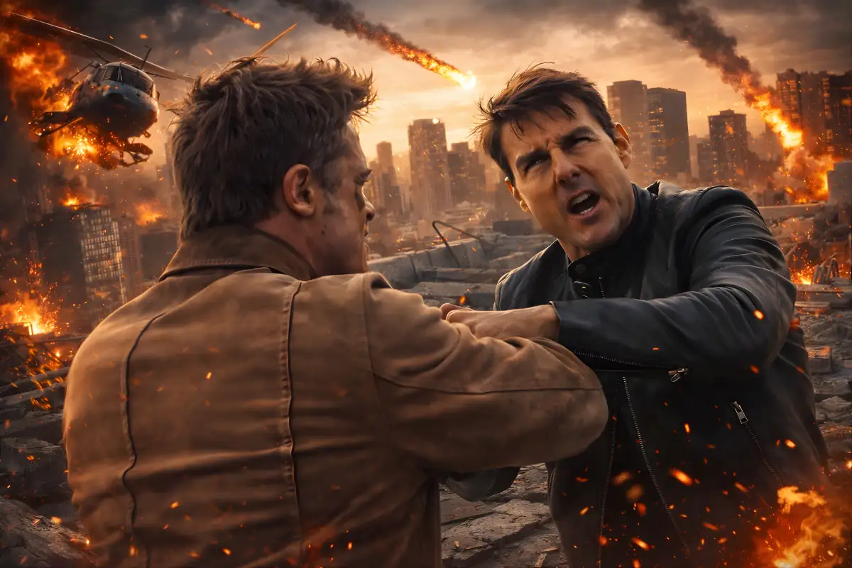 The clip shows hyper-realistic versions of Tom Cruise and Brad Pitt throwing punches on a rooftop. Explosions in the back. Smooth camera moves. Lighting that looks like a real movie set.